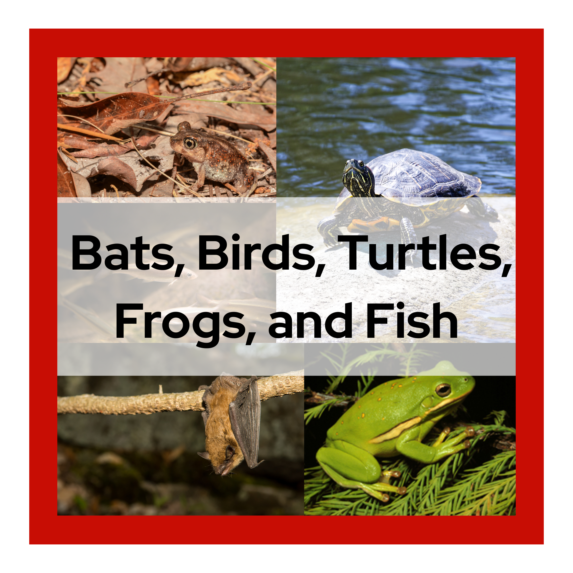 Bats, birds, turtles, frogs, and fish